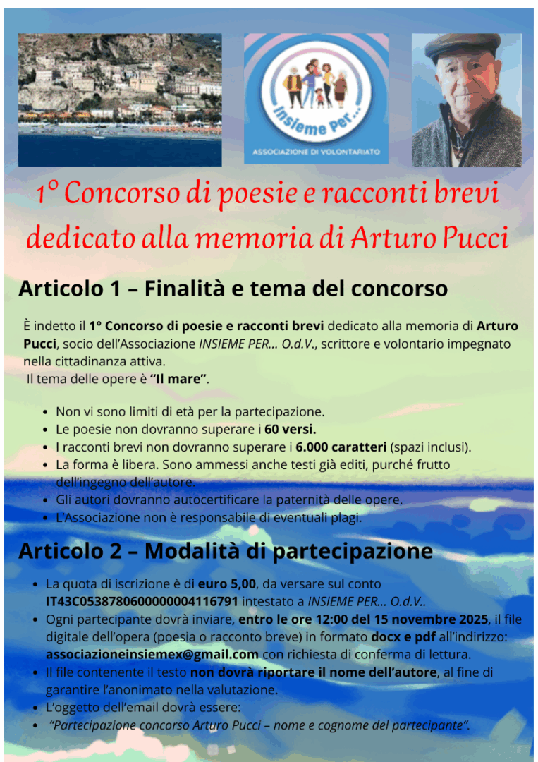 E’ indetto il primo concorso di poesie e racconti brevi dedicato alla memoria di ARTURO PUCCI , socio dell’associazione INSIEME PER…O.d.V., scrittore e volontario impegnato nella cittadinanza attiva.