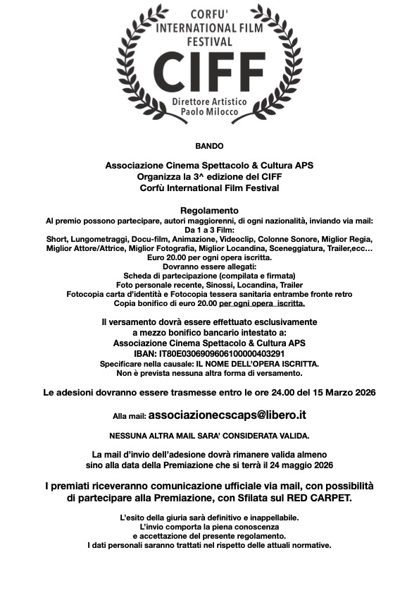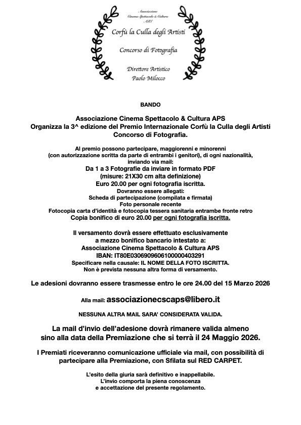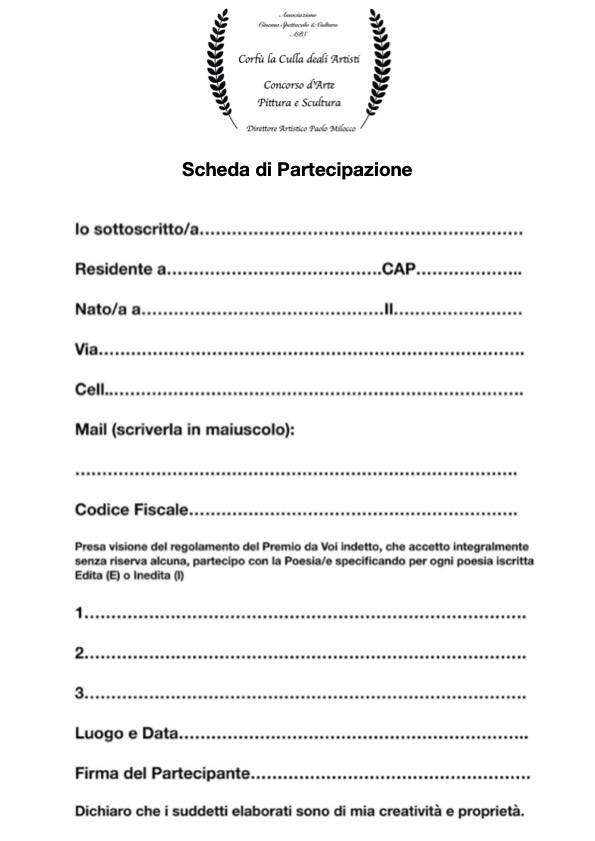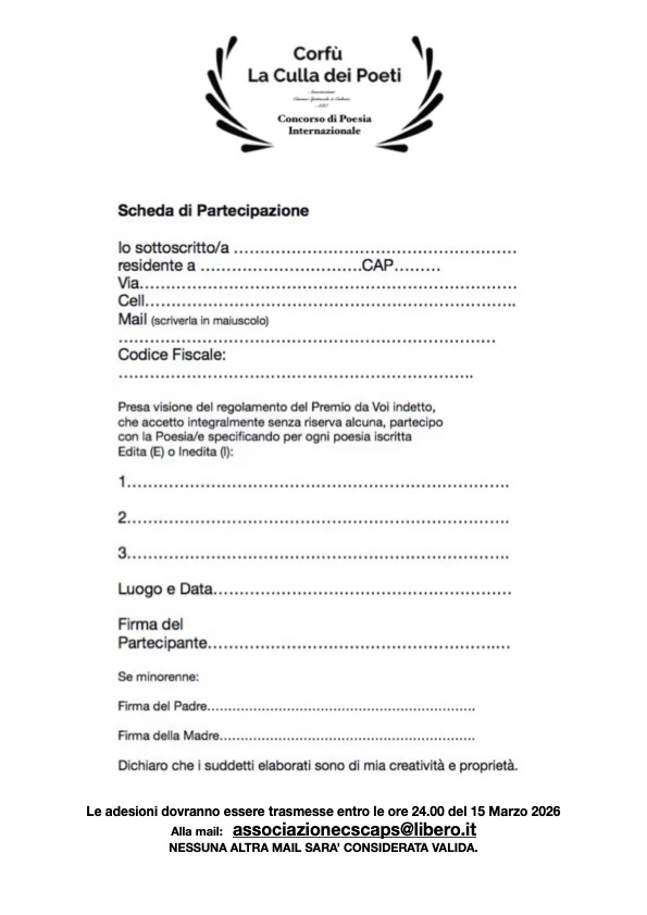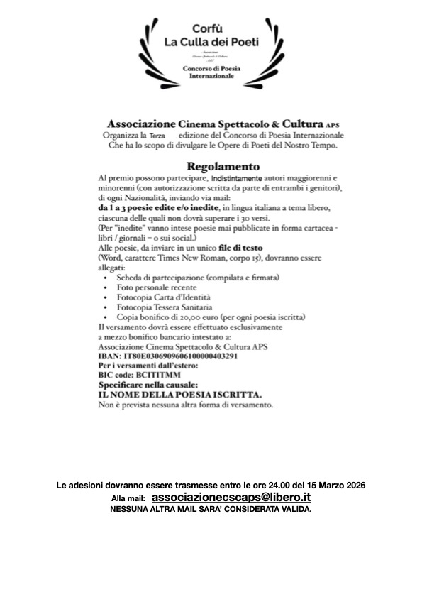 - Copia bonifico di 20.00 € (per ogni poesia iscritta).