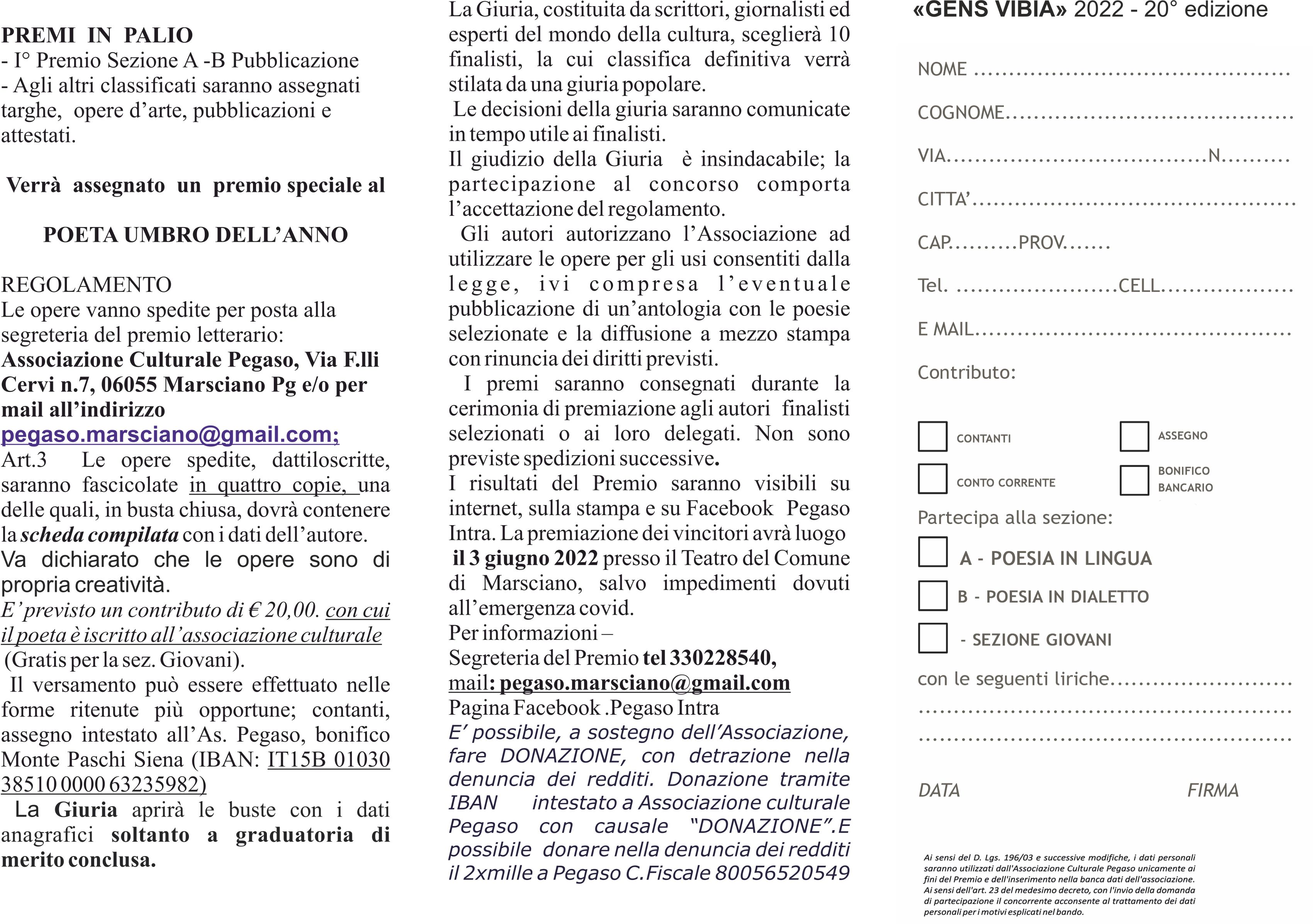 L’associazione culturale Pegaso, con il patrocinio della Regione Umbria, la Provincia di Perugia, il Comune di Marsciano, INTRA, Lions Club Marsciano, indice il 20° Premio letterario nazionale Gens Vibia