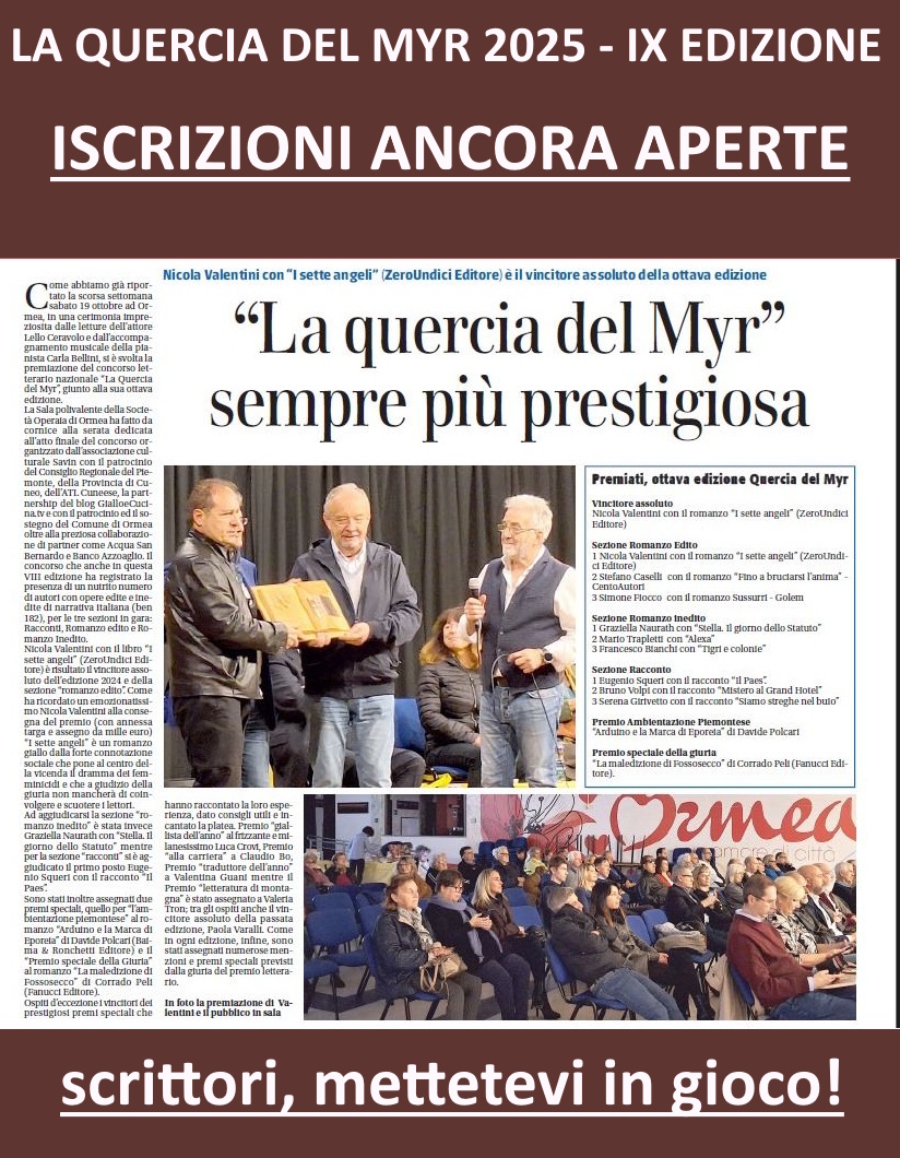- D: Allegato “A” (L’allegato è reperibile sulla pagina facebook “La Quercia del Myr” oppure sul sito dell’Associazione: “www.nobru.it” nonché sul sito: www.concorsiletterari.net)