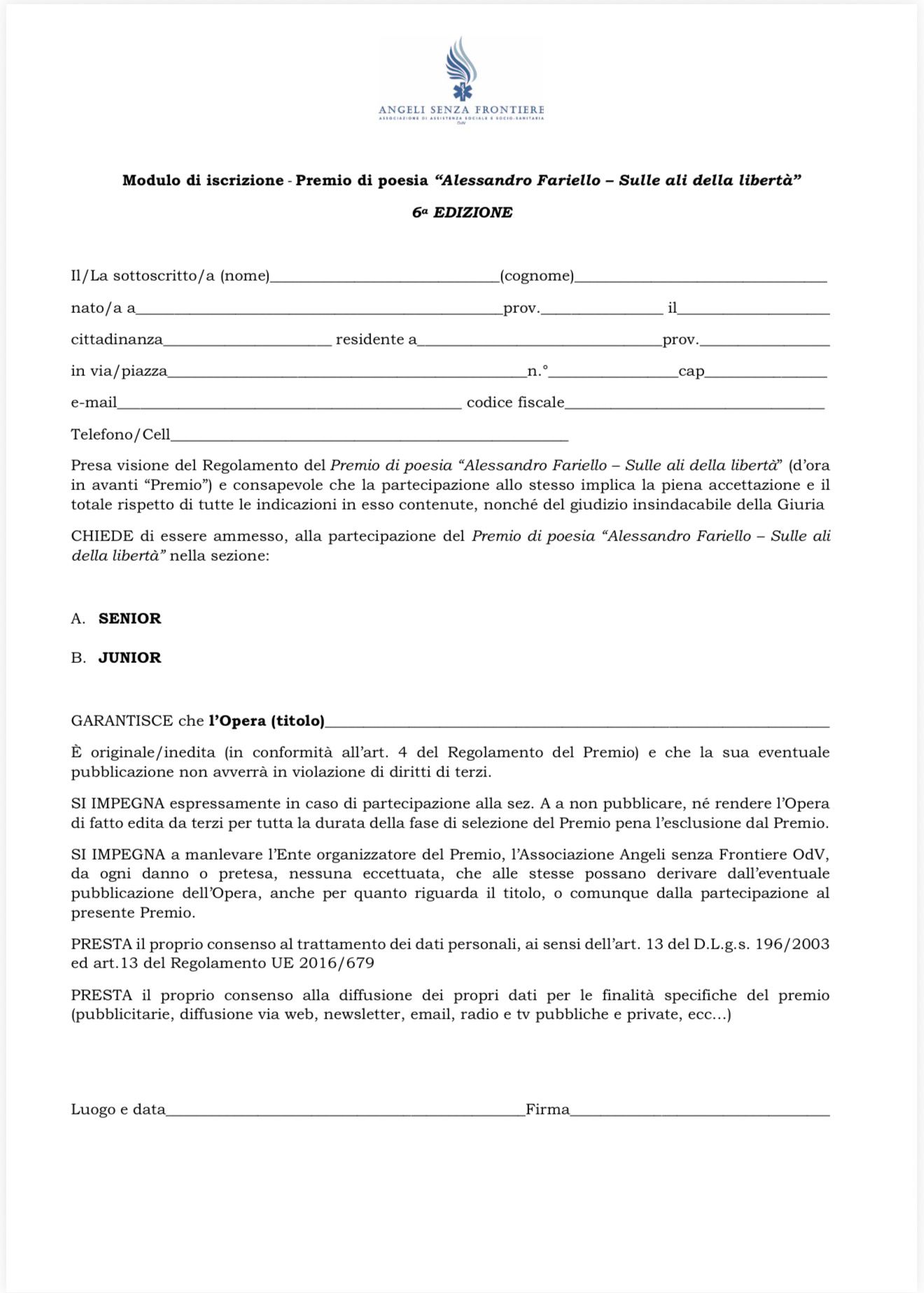 Il Comitato organizzatore dell’Associazione Angeli senza Frontiere lascia libertà di espressione chiedendo, comunque, il rispetto del senso civile e, pertanto, si riserva il diritto (a suo insindacabile giudizio) di rifiutare poesie a contenuto blasfemo o non conformi alla propria morale.