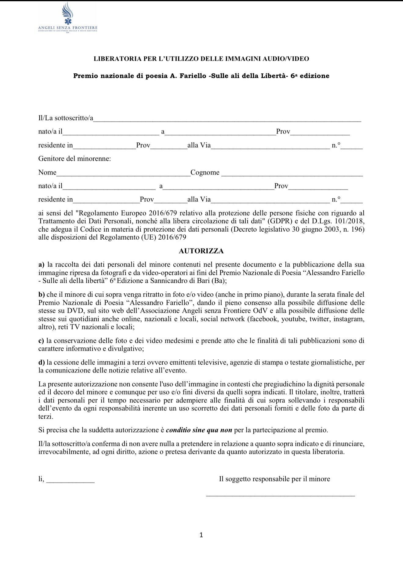 Il Comitato organizzatore dell’associazione Angeli senza Frontiere non si assume alcuna responsabilità per plagi, dati non veritieri, violazione della privacy, falsificazioni e attribuzioni illegittime di paternità delle poesie o di qualunque altro atto non conforme alla legge compiuto dall’autore.