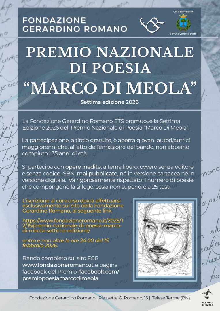 La Fondazione Gerardino Romano ETS di Telese Terme (BN) bandisce la settima edizione del Premio Nazionale di Poesia “Marco Di Meola” il cui svolgimento viene disciplinato dagli articoli seguenti.