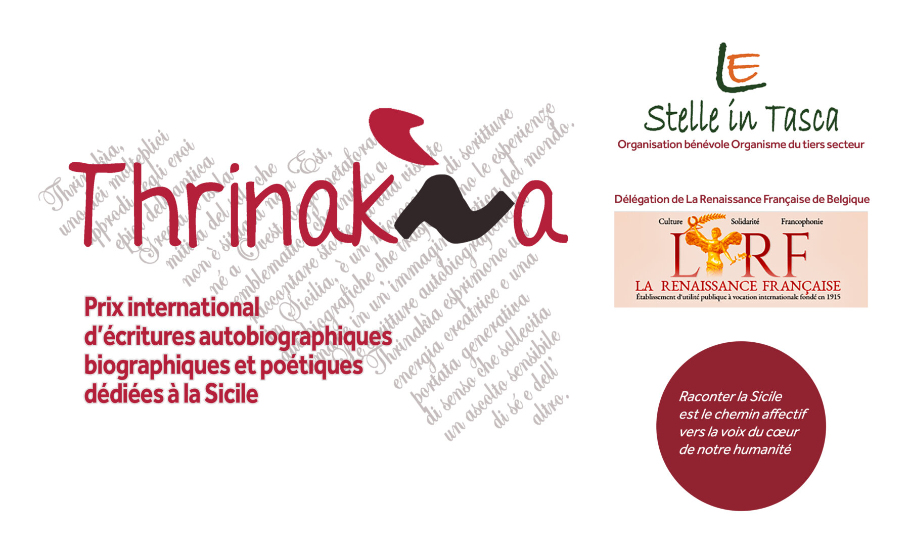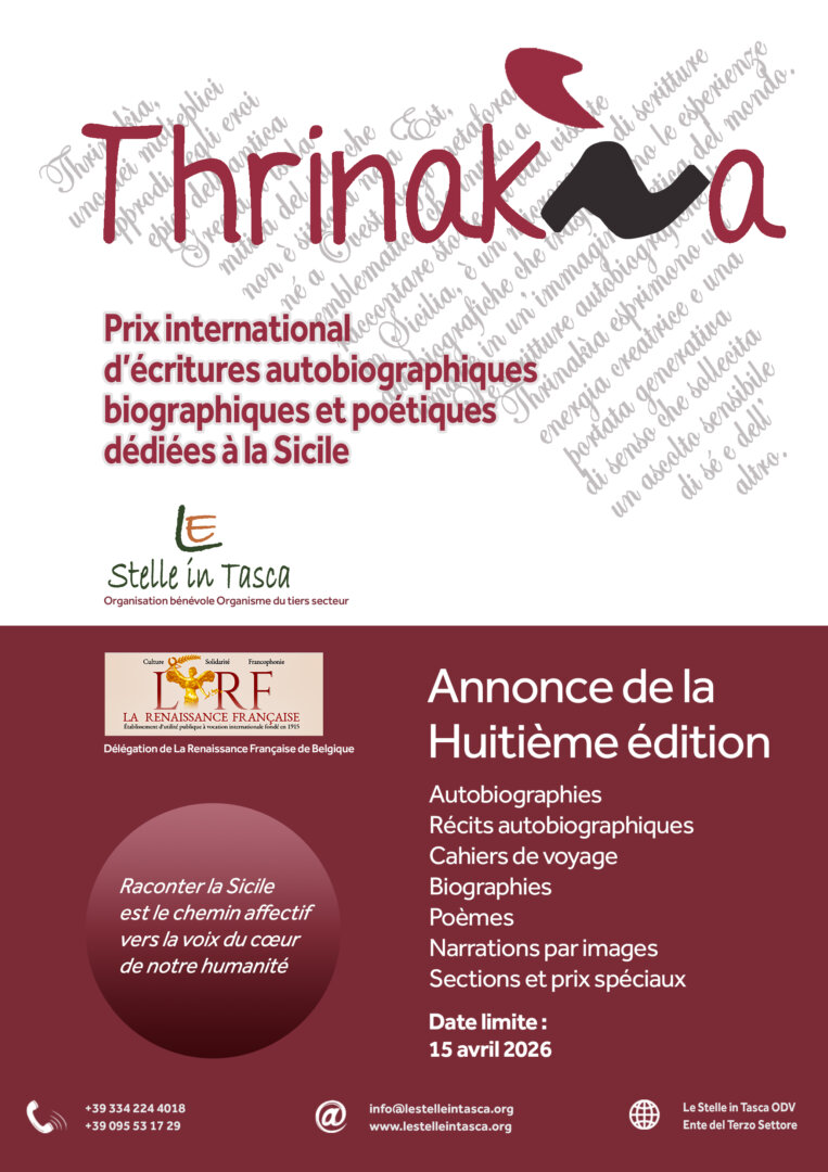 «La Rinascita Francese del Belgio collabora quest’anno con il premio letterario internazionale Thrinakìa (nome mitologico della Sicilia). Questo prestigioso evento, che si tiene per l’ottava volta nella città di Catania, è rivolto a tutti gli autori, esordienti o affermati, che presenteranno un testo relativo alla Sicilia, nel campo della narrativa, del racconto di viaggio, dell’autobiografia o della poesia. La Rinascita Francese del Belgio è orgogliosa di partecipare a questa avventura, che valorizza la creazione letteraria, la bellezza della Sicilia, l’uso della lingua francese e l’amicizia tra i popoli. In questa occasione assegnerà un premio speciale LRF Belgique e una medaglia, che saranno consegnati dal presidente della Delegazione belga nel corso della cerimonia di premiazione che si terrà a Catania.»