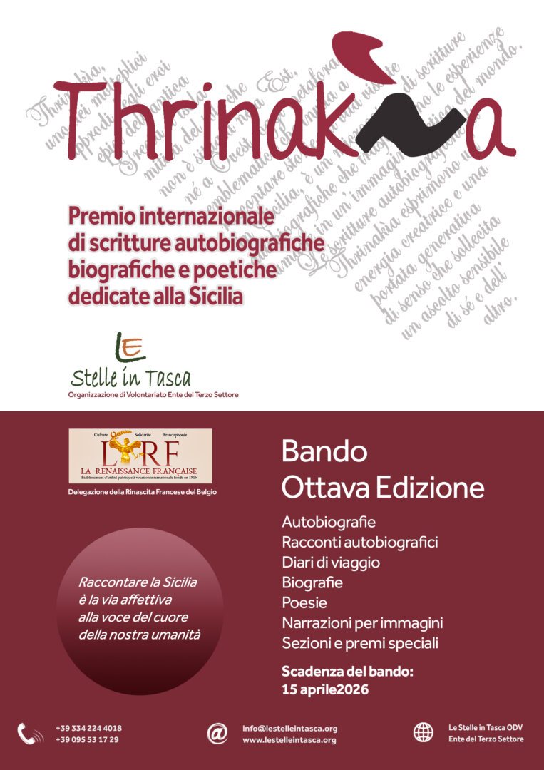 È bandita l’ottava edizione di Thrinakìa, premio internazionale di scritture autobiografiche, biografiche e poetiche dedicate alla Sicilia. Il premio, ideato e realizzato dall’Organizzazione di Volontariato Le Stelle in Tasca – Ente del Terzo Settore, nasce nel 2012 nell’ambito del progetto di animazione sociale e culturale degli Ateliers dell’immaginario autobiografico. Le Stelle in Tasca, organizzazione iscritta al Registro Unico Nazionale del Terzo Settore (RUNTS: repertorio 61139), propone fin dal 2005 degli atelier di narrazione, di lettura e di scrittura autobiografica, privilegiando una pedagogia della memoria e dell’immaginario, un’etica della reciprocità e dell’ascolto sensibile di sé e dell’altro. Le opere autobiografiche che sono state donate nel corso di questi anni sono diventate un patrimonio culturale immateriale custodito dall’Archivio della memoria e dell’immaginario siciliano, associato alla rete europea degli archivi autobiografici dell’EDAC – European Ego-Documents Archives and Collections Network.