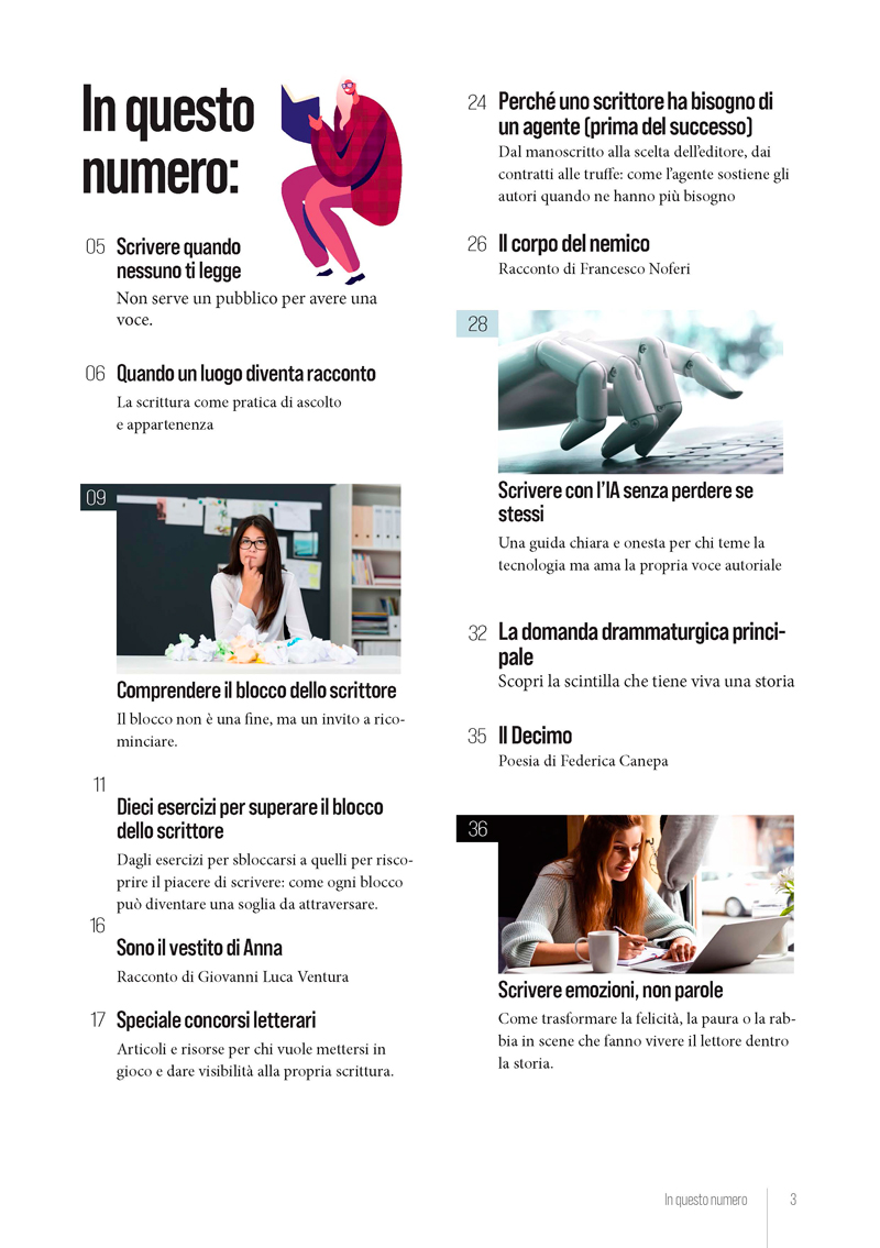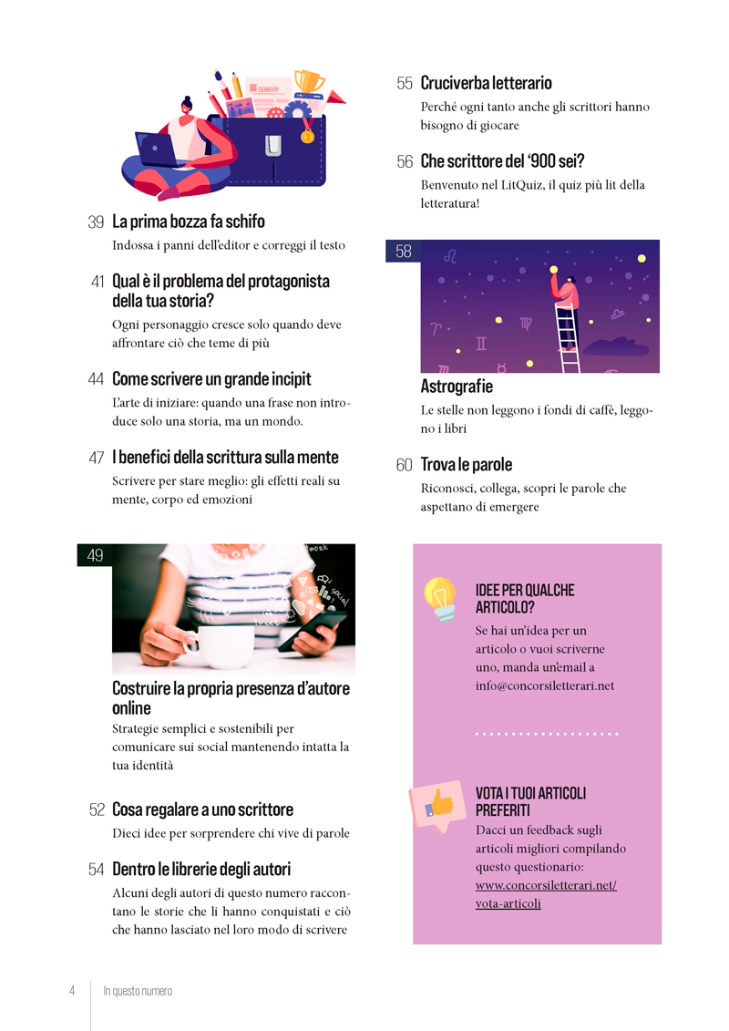 Ogni numero dà spazio alle voci di chi vive la scrittura da prospettive diverse: giurati, autori premiati, organizzatori di concorsi e rassegne.