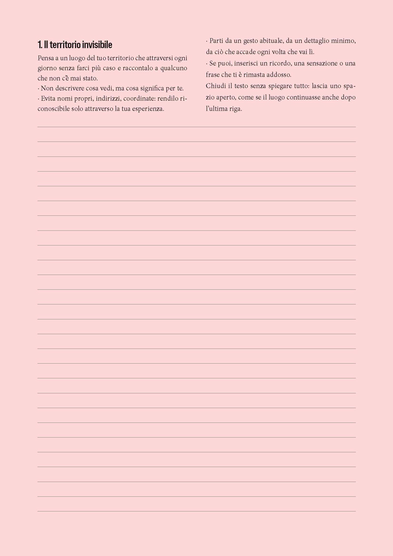 Esercizi, giochi narrativi e spazi per fermarti a scrivere. Non scorri le pagine: le attraversi. Alcune ti chiedono di rispondere, altre semplicemente di restare.