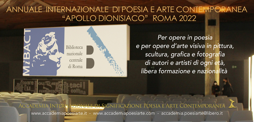 L’Accademia Internazionale di Significazione Poesia e Arte Contemporanea, polo no profit di libera creazione, ricerca e significazione del linguaggio poetico e artistico, in convenzione formativa con l’Università degli Studi di Roma Tre, accreditata dalla Regione Lazio, iscritta all’albo di Roma Capitale e del Comune di Canale Monterano e promossa dall’Istituto Italiano di Cultura di New York, bandisce il Premio Accademico Internazionale di Poesia e Arte Contemporanea Apollo dionisiaco, IX Edizione Roma 2022, senza scopo di lucro.